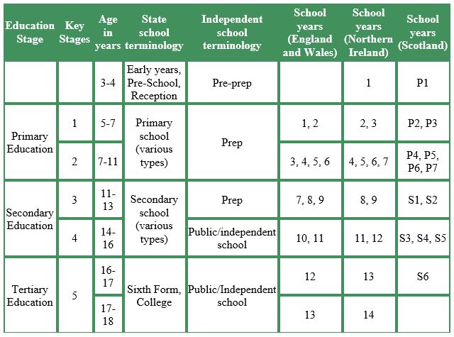 The table below shows the ages and stages of the 3 levels of education; Primary, Secondary and Tertiary: